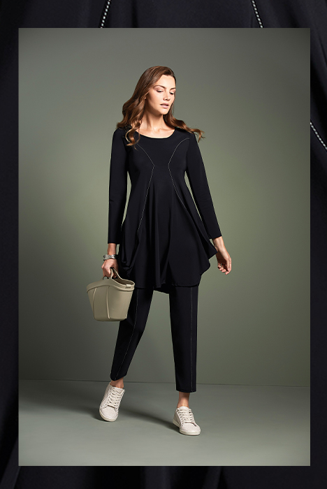 Les découpes et les lignes graphiques de la tunique, ou de la robe, mettent en valeur sans alourdir la silhouette. Avec toutes ces agapes de fin d’année, prévoir une tenue confortable qui ne serre pas la taille peut s’avérer un choix judicieux, pensez-y !
